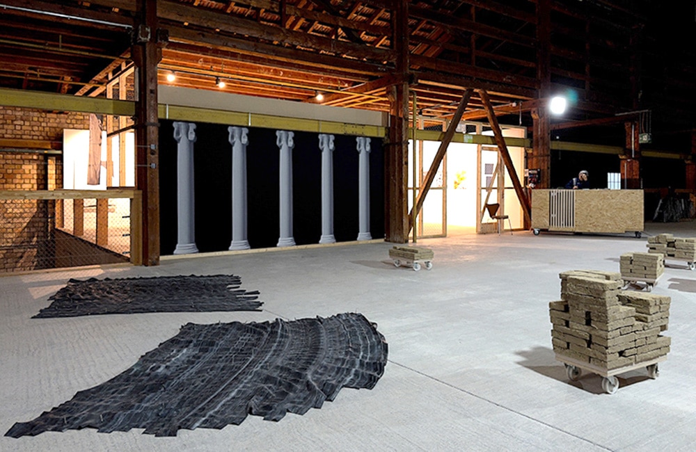 Franziska Matter zeigt neue Arbeiten zum Thema, welche aus Lehmsteinen, Veloschläuchen, keramischen Tonnen, Büchern und Stühlen bestehen.