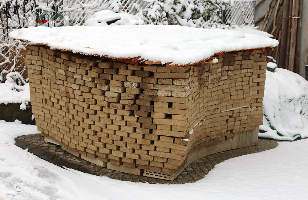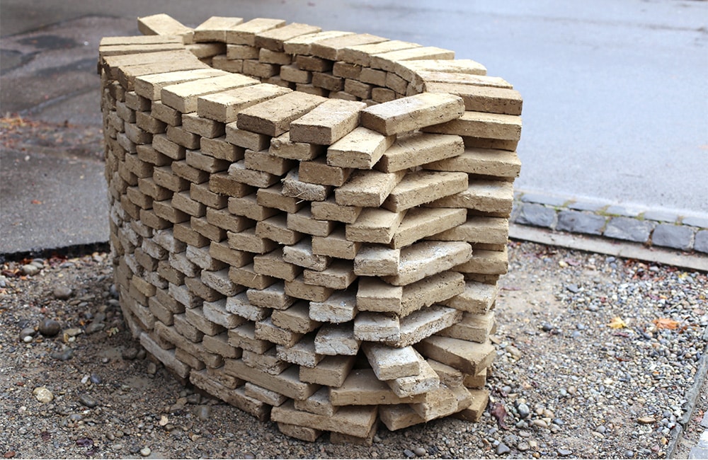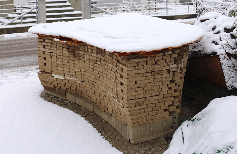 Der Fundamentbereich der Atelierfassade musste isoliert werden. Der Aushub brachte 6m3 Lehm zu Tage. Franziska Matter entschied sich gegen den Abtransport des Materials und behielt den Lehm vor Ort, um die Lehmsteine zu formen. Aus den luftgetrockneten Lehmsteinen begann sie Objekte zu bauen. Diese Objekte können jederzeit abgebaut und neu aufgebaut werden. Die Objekte stehen im Innenraum oder im Freien. Draussen benötigen sie ein Dach. Dächer stellt Franziska Matter aus einem Holzgerüst her, welches sie mit Holzschindeln verkleidet.